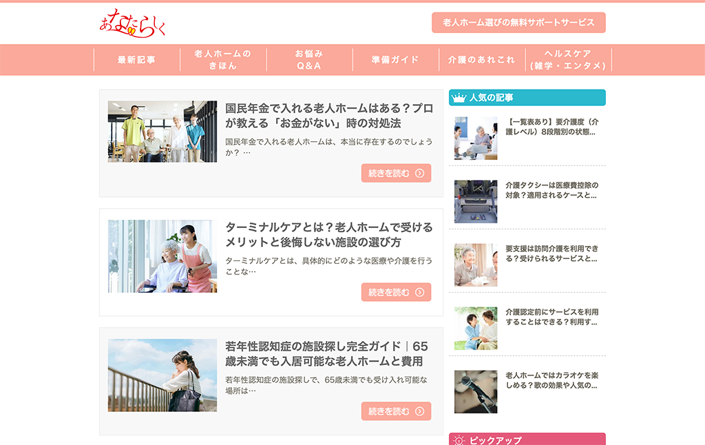 大阪・兵庫・奈良老人ホーム・高齢者施設紹介センターなどのオウンドメディアサイト。記事の更新をCMSで管理できるよう構築。